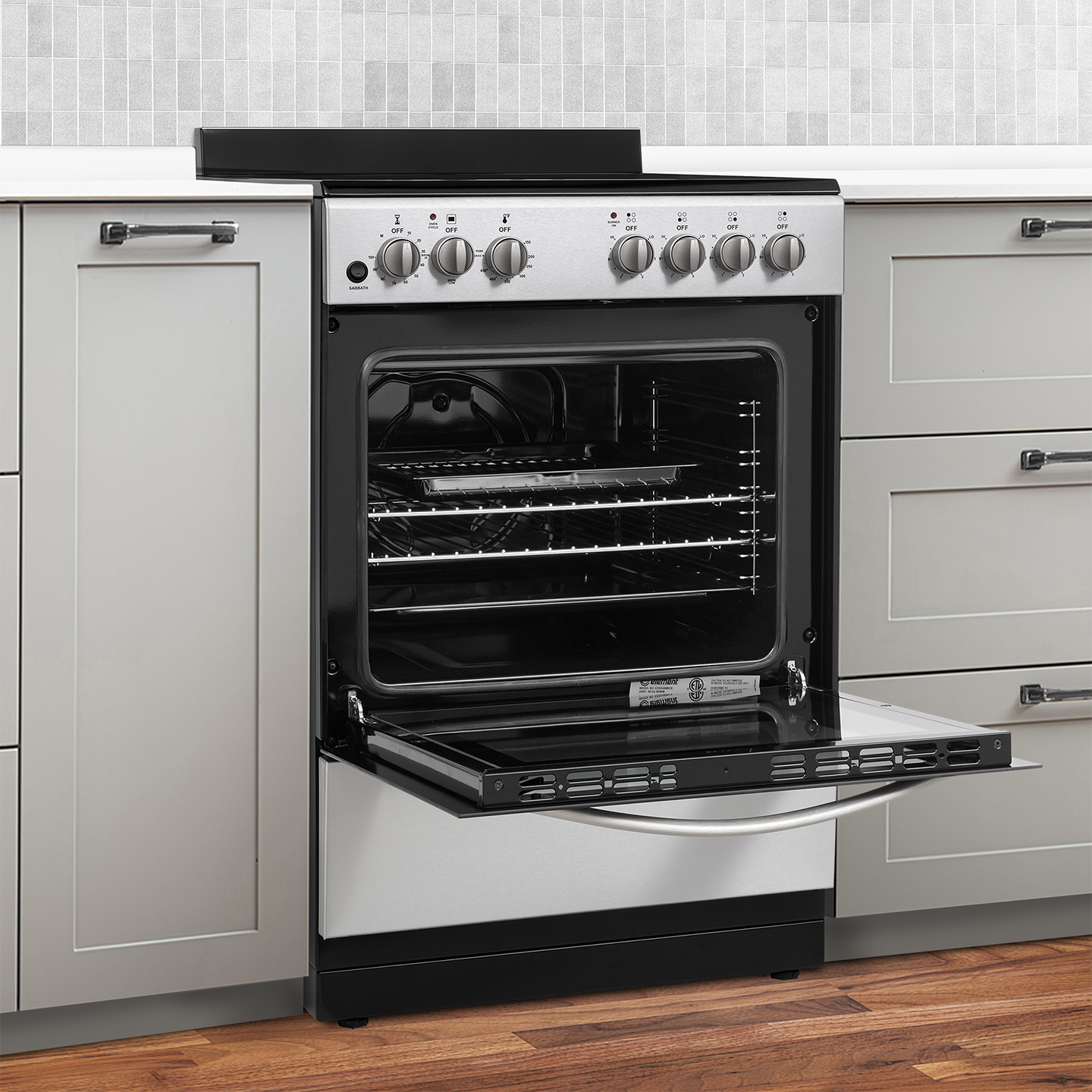 The Element EER244MSCS is a compact 24-inch electric smoothtop range designed for smaller kitchens, condos, and apartments. Its sleek stainless steel finish pairs well with modern spaces while delivering dependable everyday performance. With four radiant elements and a smooth ceramic glass cooktop, cleanup is simple and efficient. The oven includes a broil function, interior light, and timer for convenient cooking control.