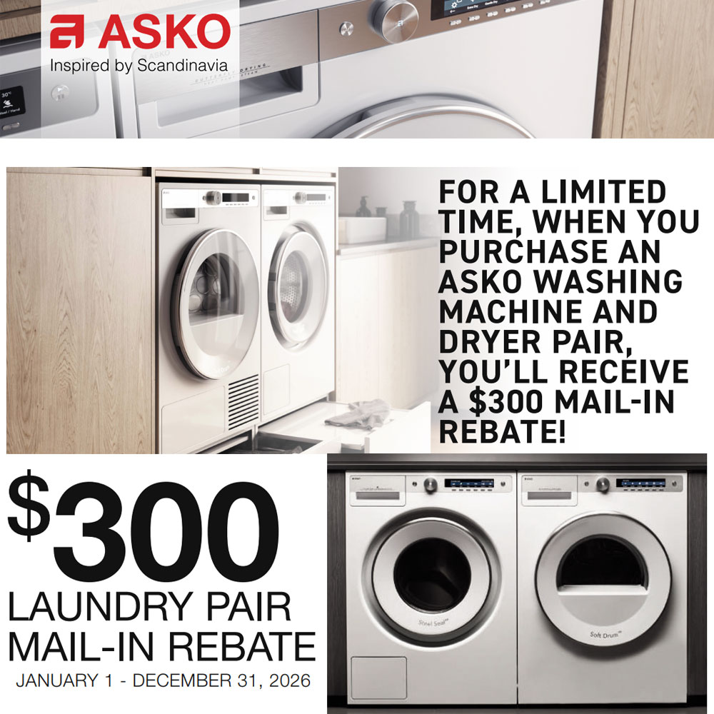 For a limited time, when you purchase an ASKO washing machine and dryer pair, you'll receive a $300 mail-in rebate