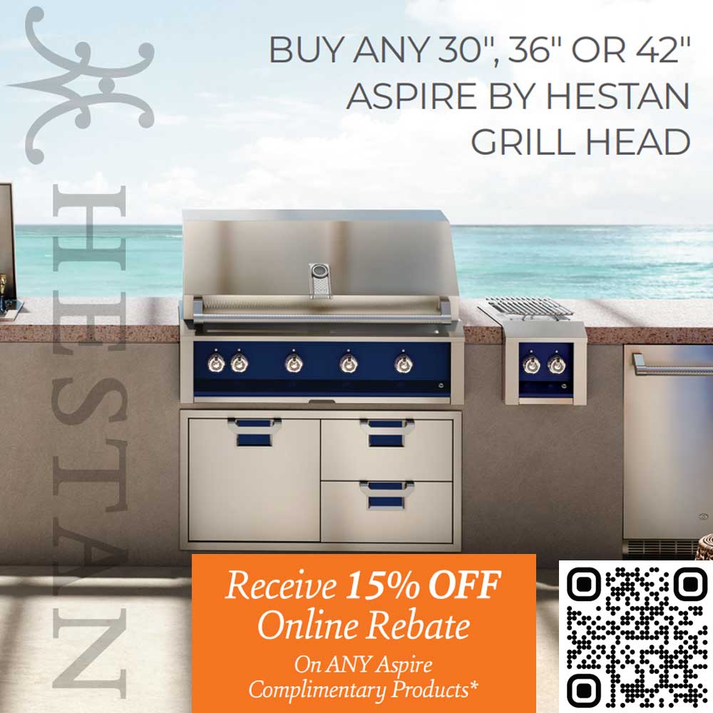 Receive a 15% OFF online rebate on qualifying Hestan Aspire Outdoor Living Suites, complimentary products, and cabinet accessories when you purchase a qualifying Hestan Aspire grill head.