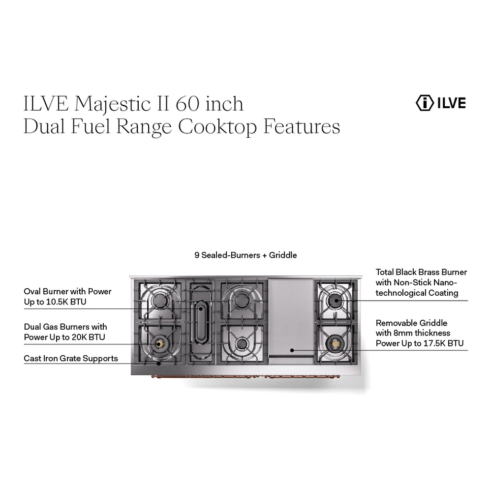 ILVE UM15FDQNS3BUGLP Majestic II 60 inch Dual Fuel Range with 9 Burners, Griddle (Liquid Propane, Solid Door, Burgundy, Brass)