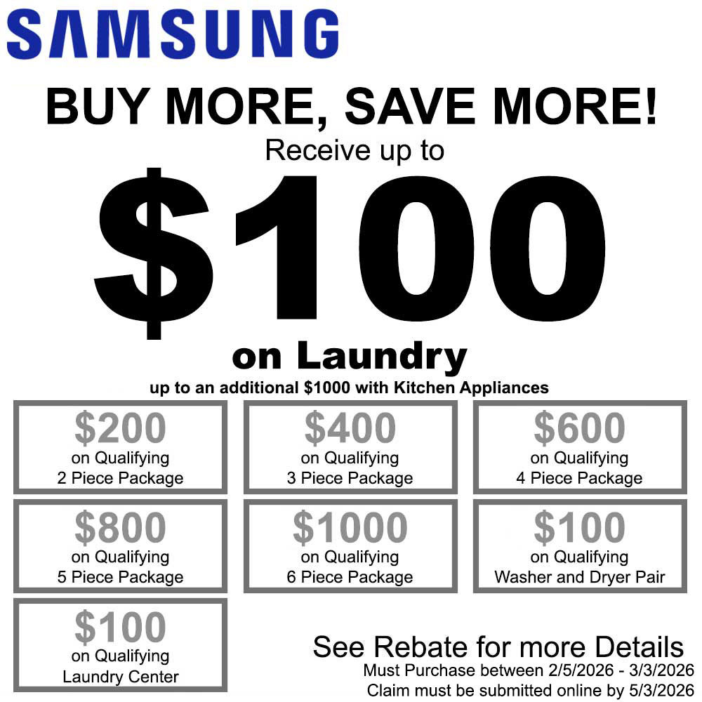 *Can be combined with the Samsung NECO Kitchen Appliance Rebate (ALL PRODUCTS MUST BE ON ONE INVOICE)